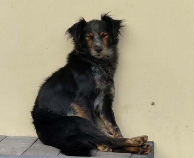 Ma czarną sierść z akcentami białego na grzbiecie.