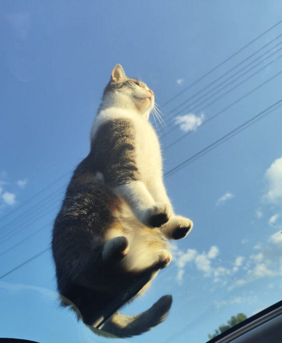 To wielokolorowa kotka (biała z rudymi, brązowymi i czarnymi plamami)-dachowiec.